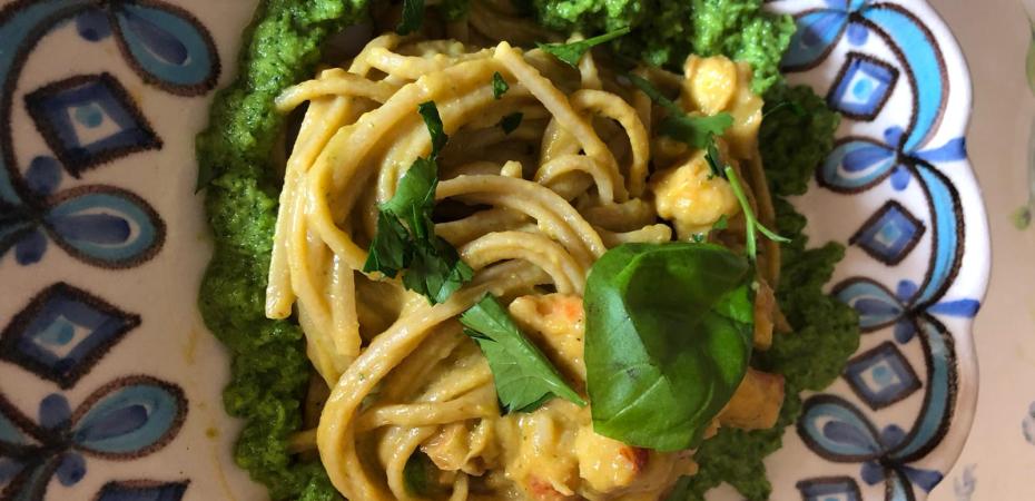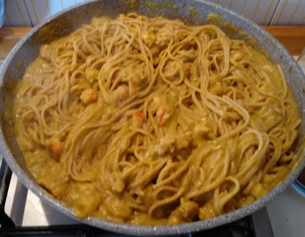 Per 7/8 persone: 640 grammi di linguine integrali, 2 kg di gamberoni, 12 zucchine, 1 cipolla, 1 scalogno, 1 carota, prezzemolo, 8 foglie di basilico, 1 bicchierino di Brandy.