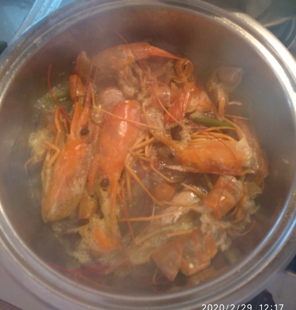 Pulire i gamberoni e mettere da parte teste e gusci. Preparare un fumetto di pesce con cipolla, carota, gambi di prezzemolo, teste e gusci di gamberoni. Dopo aver fatto soffriggere il tutto aggiungere 300 dl di acqua e far cuocere 30 minuti. Filtrare il fumetto in un recipiente.