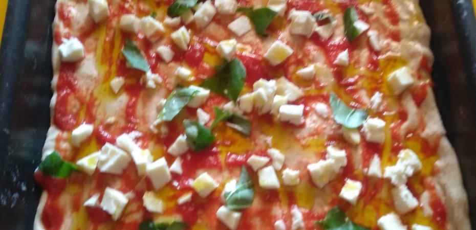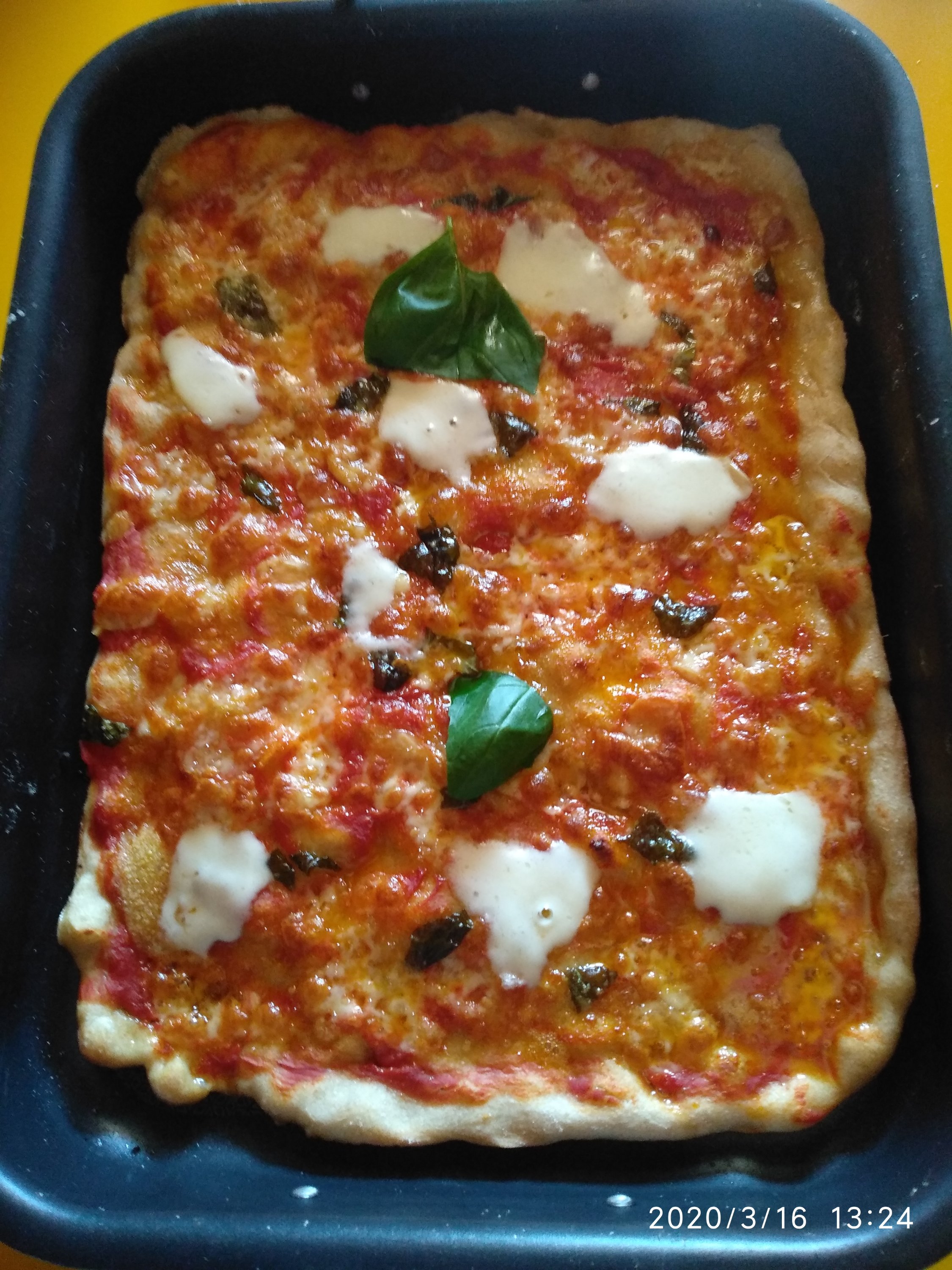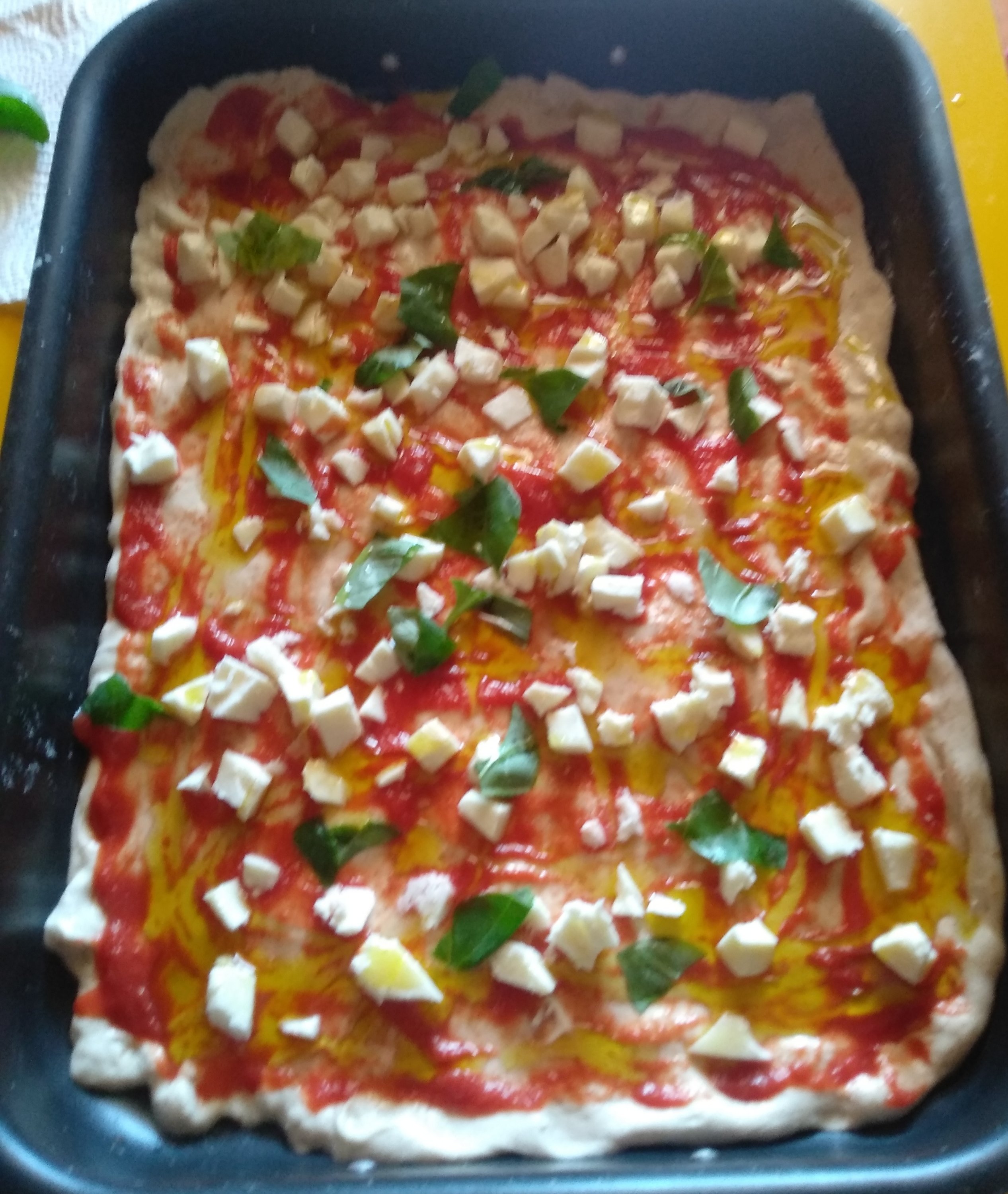 Pizza margherita: passata di pomodoro, olio extravergine, mozzarella, basilico. Cottura 15 minuti in forno a 250 gradi