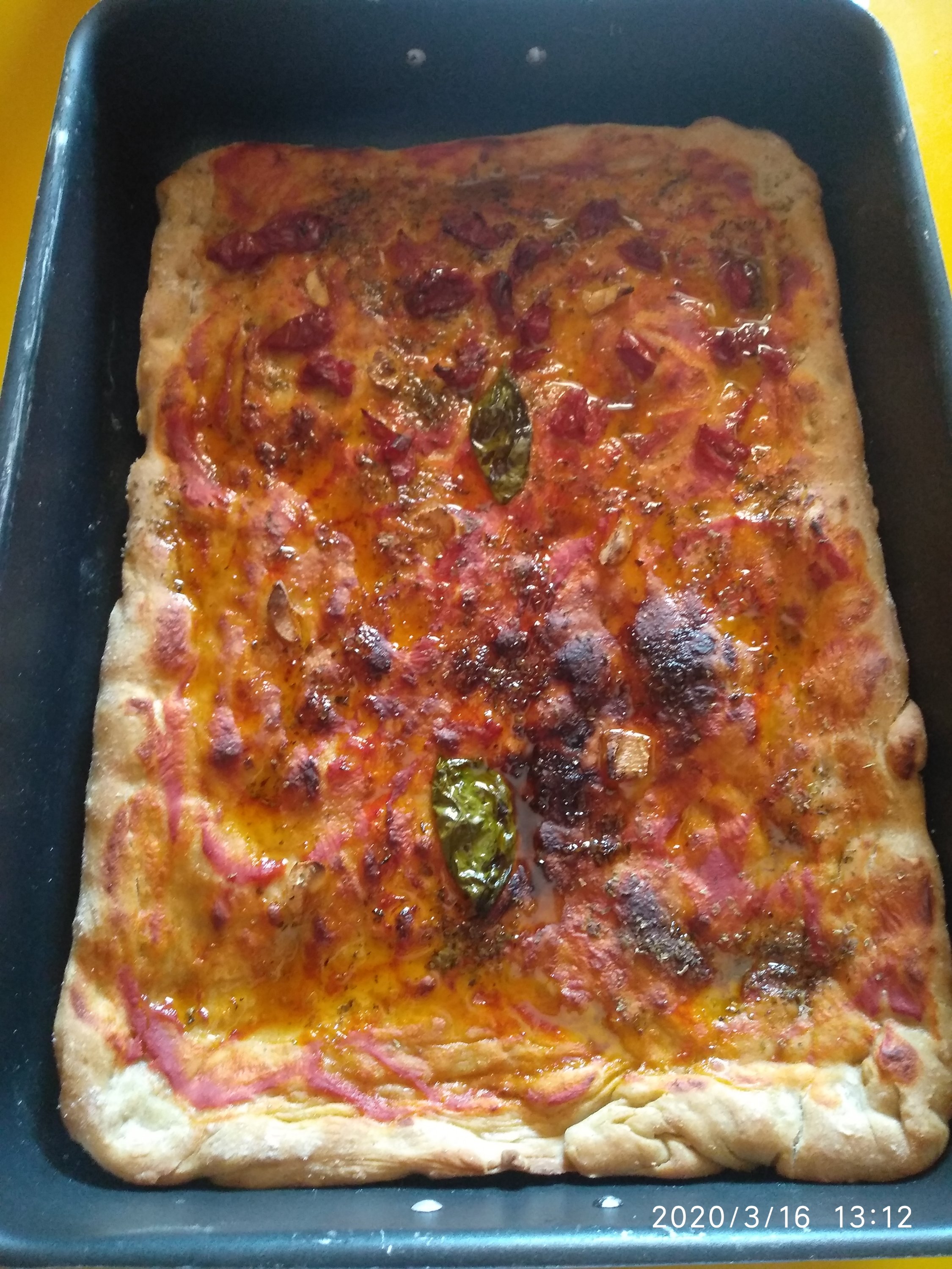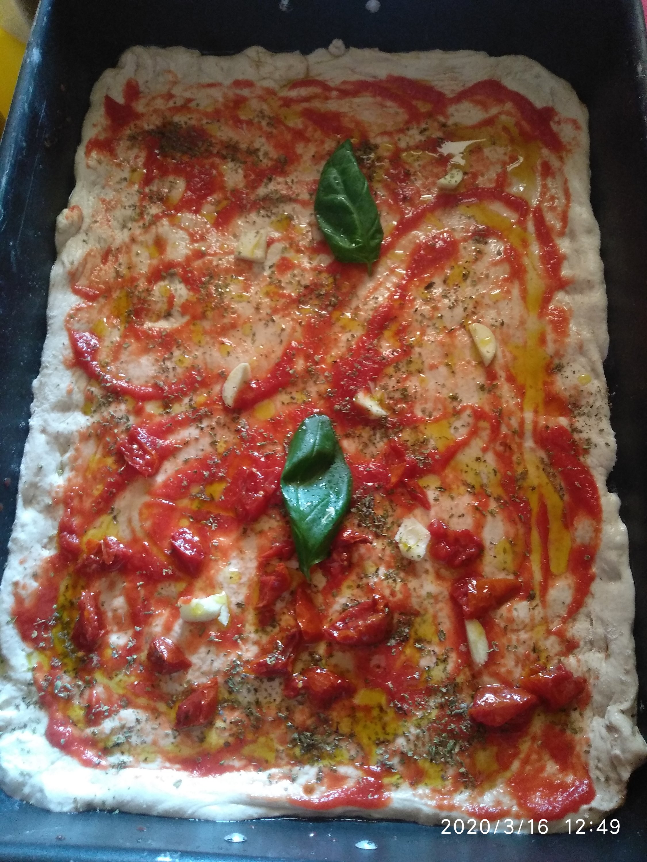 Pizza marinara con olio extravergine di oliva, passata di pomodoro, pomodorini rossi semidried, aglio, origano.cottura 15 minuti con forno (purtroppo elettrico) a 250 gradi