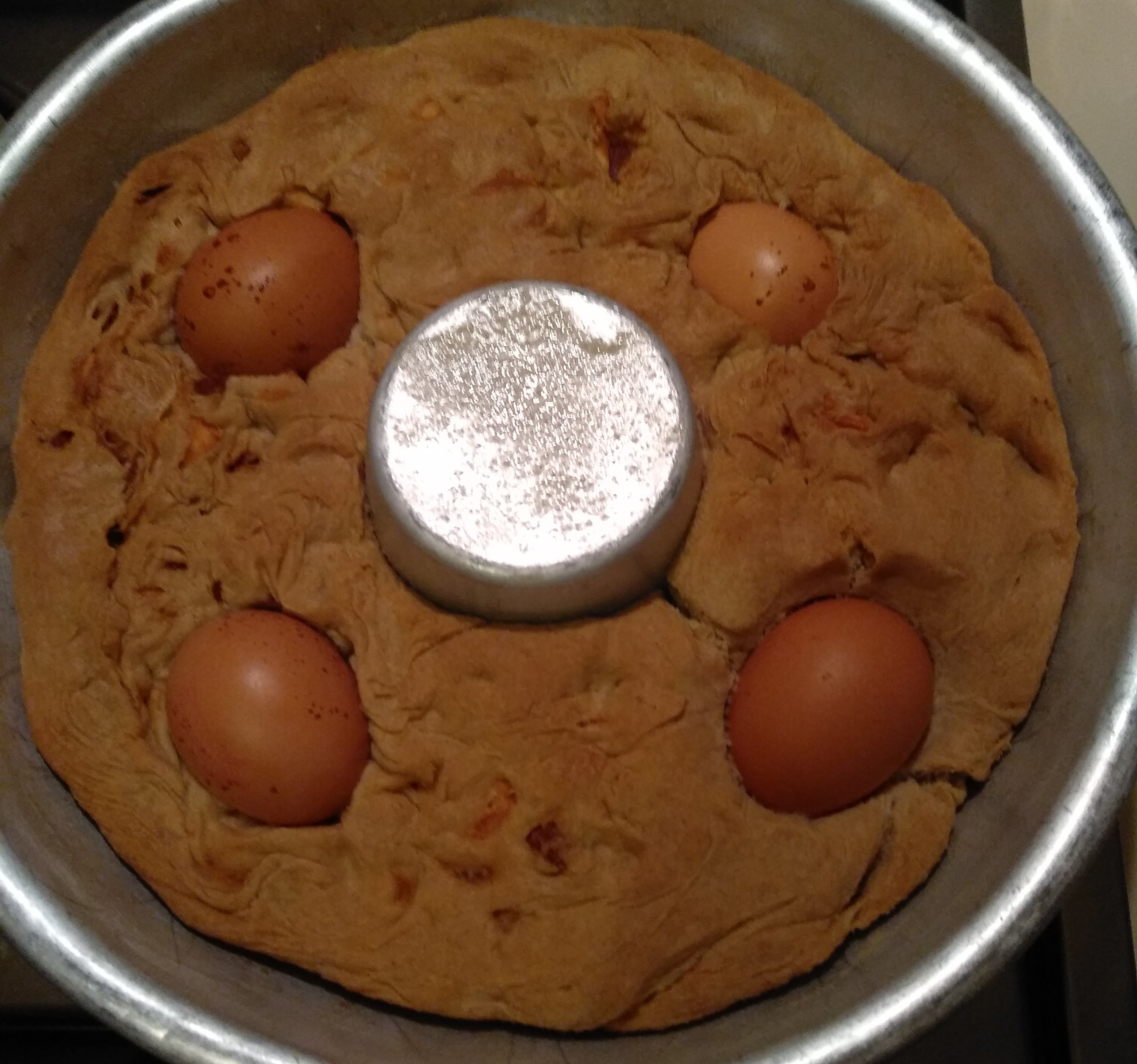 Versate in una ciotola acqua e lievito. Aggiungere metà parte di farina e lavorare l’impasto. Aggiungere metà del burro, quindi il resto della farina con sale e pepe. Lavorare per altri due minuti. Infine aggiungere il resto del burro e 50 grammi di pecorino. Lavorare con le mani e far lievitare per un’ora. Poi stendere l’impasto su un piano infarinato disponendovi sopra salame e provolone tagliati a tocchetti. Aggiungere gli altri 20 grammi di pecorino. Arrotolare e disporre in uno stampo formando una ciambella. Fare lievitare al caldo per altre tre ore. Posizionare le uova sulla superfice. Ungere con olio aiutandosi con un pennellino. Infornare a 180 gradi per un ora.