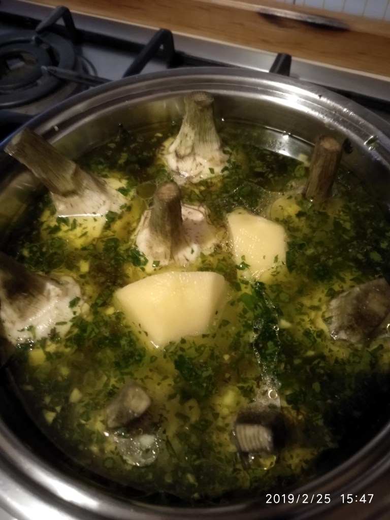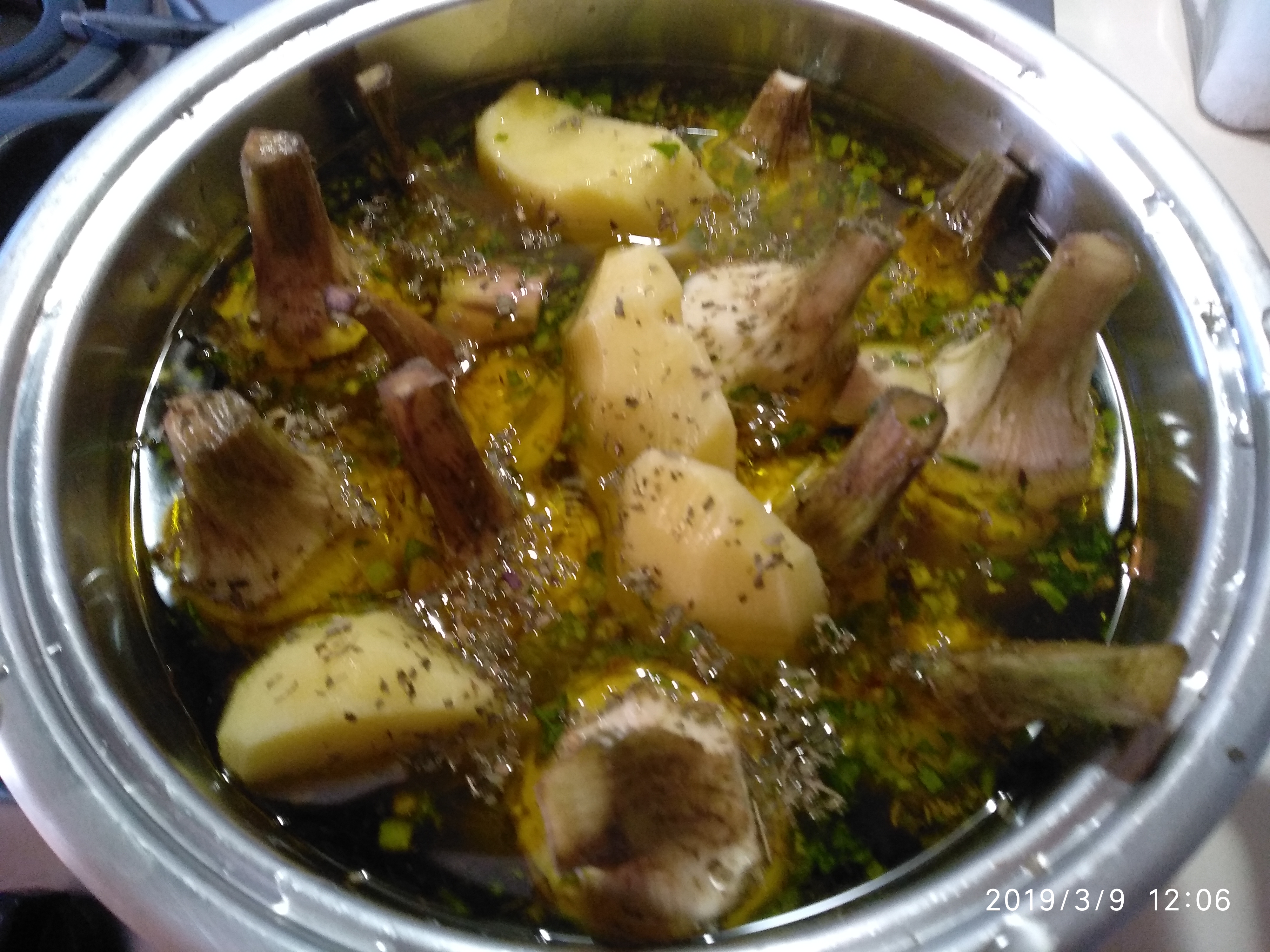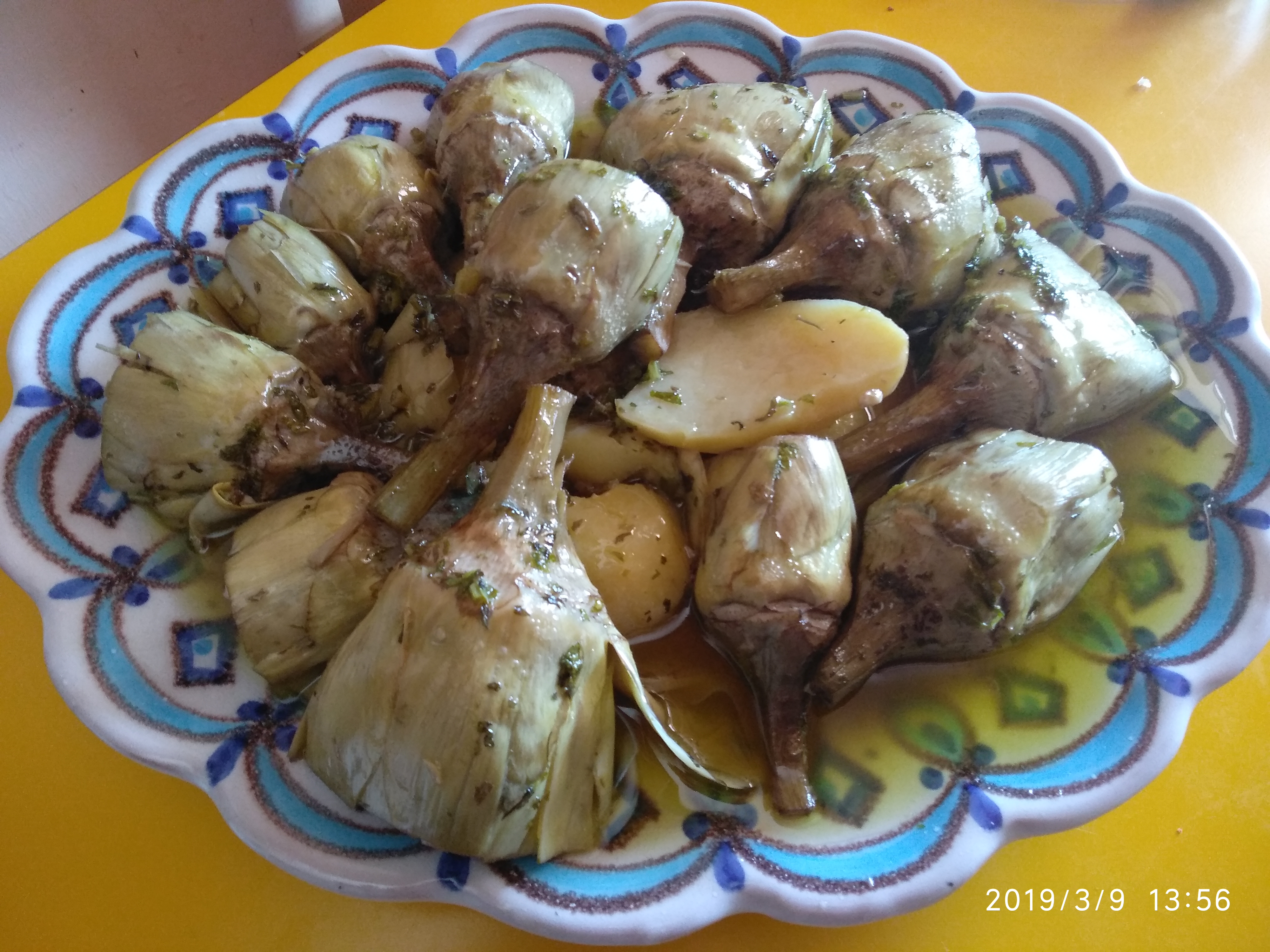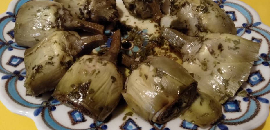 Per 4 persone. Preparate un trito di prezzemolo, menta e aglio. Mescolate questo trito con l’ aggiunta di qualche cucchiaio di olio, di sale e pepe. Mondate 8 carciofi, eliminate le foglie più dure, affilate le punte e tagliate solo una piccola parte dei gambi. Aprite il cuore dei carciofi immergeteli in acqua e limone. Scolate i carciofi, fateli sgocciolare e riempite l’ interno con il trito preparato in precedenza. Sistemateli capovolti in una pentola con bordi alti in modo da lasciare i gambi all’insù. I carciofi devono essere sistemati molto stretti, utilizzando se necessario una patata. Versate 2 dl di olio extravergine e ricoprite i carciofi con l’acqua. Aggiungete a metà cottura un po’ di vino bianco. Fate cuocere a fuoco lento fino a fare evaporare completamente l’acqua e servite