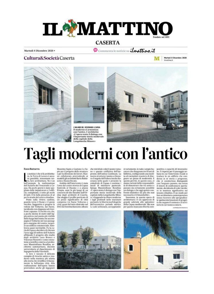 Questi anni saranno ricordati per quello che è stato prodotto, non per quello che è stato conservato. Fa scalpore pensare che qualcuno si indispettisca perché a Capua si faccia architettura, tra l’altro con tutte le difficoltà legate da anni alla crisi economica. L’Aulario del Vescovado a Capua fa bella presenza di sé per le strade del centro cittadino. Posto sulla riviera casilina, guarda verso il fiume e il ponte vecchio. Suggestiva è proprio la veduta dal Volturno, dal fiume, incidendo con eleganza sul riverfront capuano.