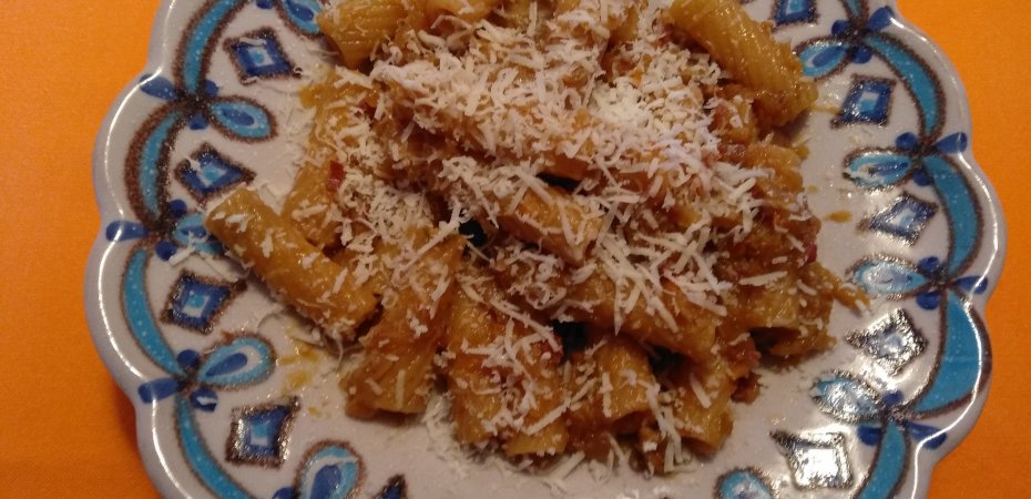Per 5 persone. Mettere in una casseruola un dl e mezzo di olio extravergine, un trito di una costa di sedano, carota e un chilo e mezzo di cipolle ramate di Montoro, 150 grammi di prosciutto a tocchetti (in alternativa al salame napoletano), un girello di scottona da un chilo. Aggiungere 5 dl di acqua. Coprire e fare cuocere a fuoco lentissimo per due ore e mezza. Togliere il girello, alzare la fiamma e fare asciugare aggiungendo due dl di vino bianco fino ad ottenere una sughetto omogeneo scuro. Fare bollire 400 grammi di tortiglioni e condirli con il sugo. Aggiungere formaggio pecorino grattugiato. Utilizzare il girello per un secondo piatto di carne con contorno di patate e broccoli.