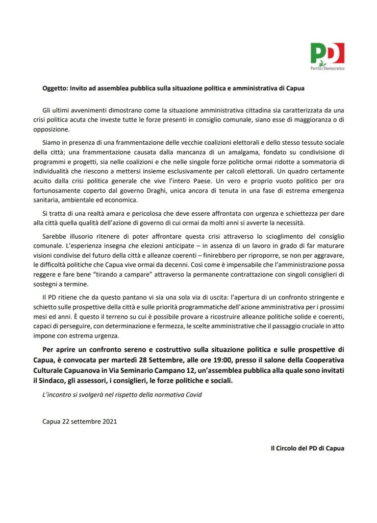 L’incontro si svolgerà nel rispetto della normativa Covid Capua 22 settembre 2021. Circolo PD Capua