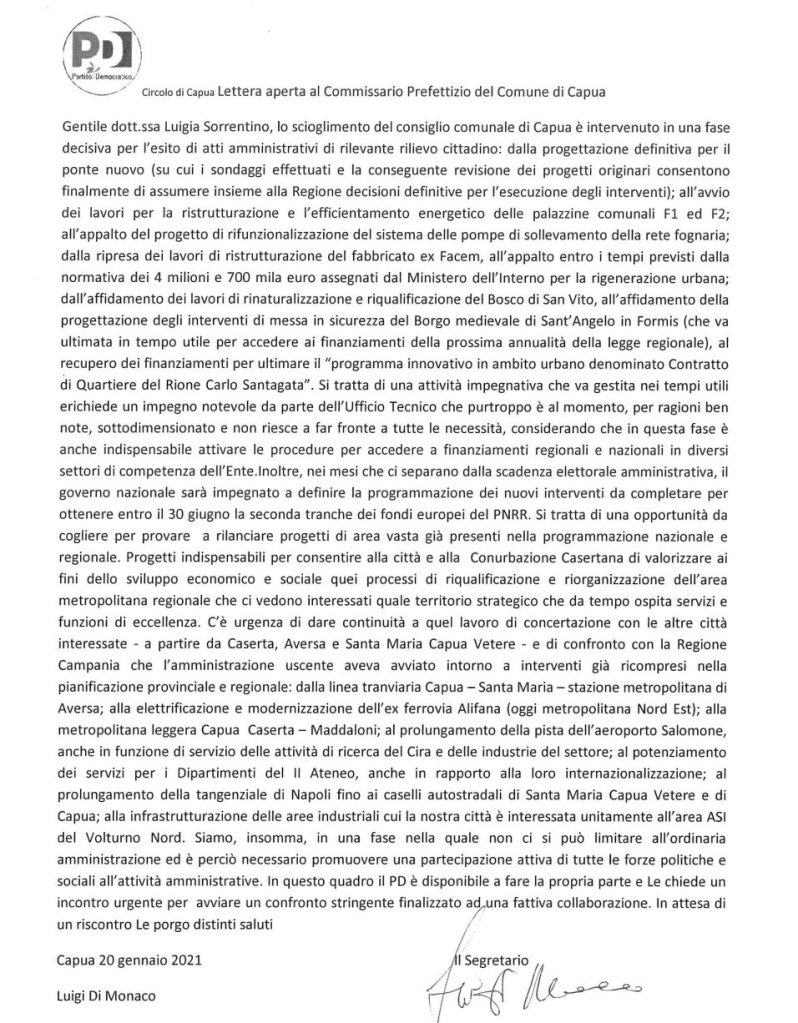 Il testo della lettera inviata dal segretario del PD Luigi Di Monaco al Commissario prefettizio del Comune di Capua