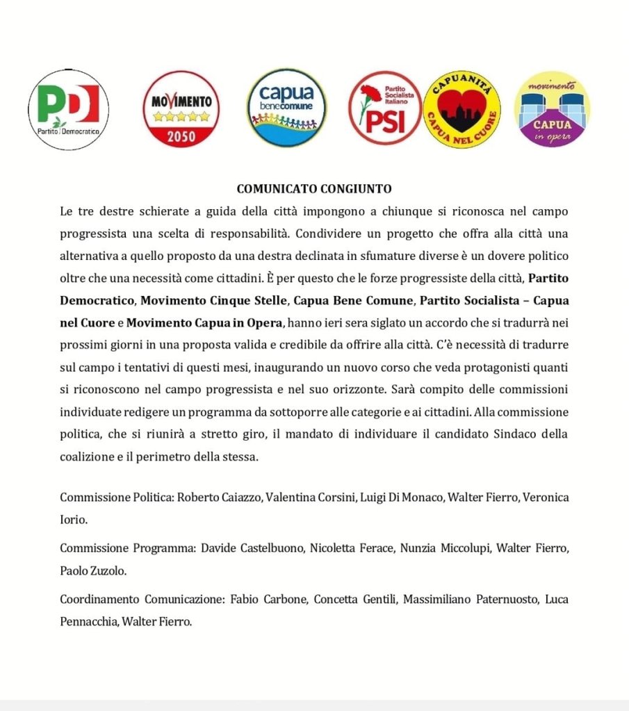 Si è svolta nella serata di ieri la riunione del nuovo centrosinistra che comincia a prendere forma in vista della prossima scadenza elettorale. Presenti Luigi Di Monaco, Concetta Gentili e Francesco Teratone per il PD, Roberto Caiazzo, Francesco Garibaldi,Nunzia Miccolupi e Massimiliano Paternuosto per il movimento 5 stelle, Fabio Carbone, Valentina Corsini e Ludovico Del Santo per Capua Bene Comune, Walter Fierro per Socialisti – Capua nel cuore, Davide Castelbuono, Veronica Iorio e Luca Pennacchia per Capua Futura. Si è deciso di costituire tre commissioni: una programmatica, incaricata di stilare il programma della coalizione; una politica che ha il compito di definire i confini della coalizione e una proposta di candidato alla carica di Sindaco; una commissione che curi la comunicazione. L’obiettivo è di arrivare entro sette giorni ad una nuova riunione della coalizione che predisponga una proposta complessiva di programma, liste e candidatura a Sindaco, da sottoporre al vaglio delle assemblee delle forze politiche e della città. Anche se il percorso che ha portato a questa prima intesa è stato lungo e travagliato non c è dubbio che può essere questa la coalizione in grado di sparigliare le carte e battere la frammentazione senza precedenti che ha fin qui caratterizzato il quadro politico cittadino. Una frammentazione che non produrrebbe niente di buono per la città, se non una ulteriore decadenza della politica con tutto il suo carico di personalismi e di instabilità che la accompagna. E questo Capua – che vive una situazione di emergenza a causa delle difficoltà finanziarie e dello sfascio in cui si trova la macchina comunale – non può permettersi in una fase nella quale una massa enorme di risorse da spendere nei prossimi cinque anni (messe a disposizione dall’Europa per uscire dalla pandemia e dalla crisi economica e sociale che ha determinato) rappresenta una occasione irripetibile per il rilancio di una città devastata sul piano della vivibilità e dei servizi ma anche ricca di opportunità su cui fare leva per invertire la tendenza al degrado e avviare un nuova fase di sviluppo e di crescita sociale e civile. Guai a sciupare questo momento magico. Nulla ovviamente è scontato ma è importante che qualcuno ci stia provando. Il successo è legato alla determinazione e al grado di coesione politica che la coalizione saprà esprimere ma anche alla disponibilità della parte sana della città di fare la propria parte. Per ora incrociamo le dita.