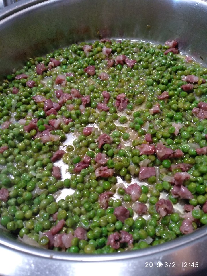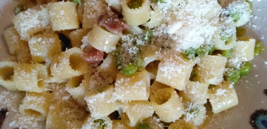 Per 5 persone. Tagliate a tocchetti 120 grammi di prosciutto crudo e uniteli ad un trito di scalogni e gambi di prezzemolo. Fate soffriggere a fuoco lento per cinque sei minuti. Bagnate con mezzo bicchiere di vino bianco e fatelo evaporare. Aggiungete 350 grammi di piselli e fate cuocere per 10 minuti aggiungendo durante la cottura pecorino grattugiato. Fate bollire 400 grammi di ditaloni, scolateli due minuti prima della cottura e fateli saltare in padella con i piselli e il sughetto aggiungendo parmigiano grattugiato.