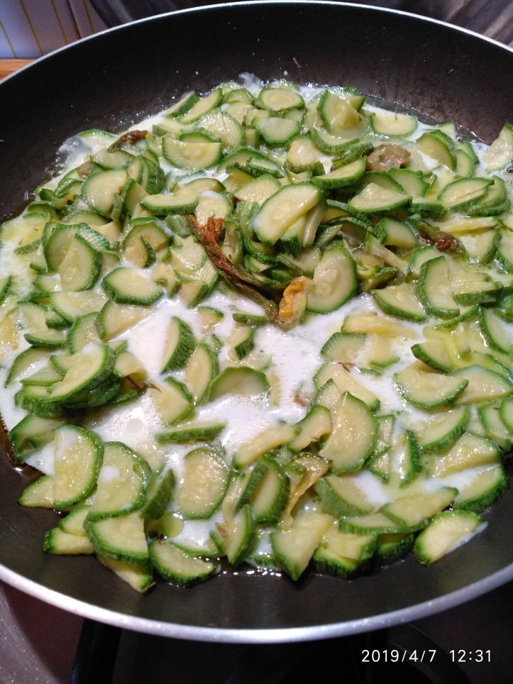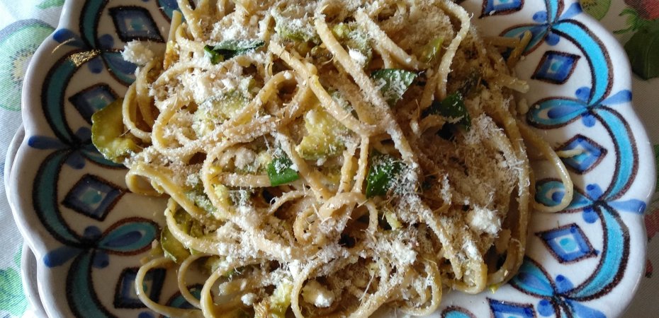 Per 4 persone. tagliate a rondelle 500 grammi di zucchine. Fate soffriggere a fuoco molto basso un trito di aglio e gambi di prezzemolo. Alzate la fiamma e aggiungete le zucchine, il sale e il timo. Dopo qualche minuto abbassate la fiamma e coprite la pentola. Dopo dieci minuti aggiungete un bicchiere di latte. Quando il latte è addensato e le zucchine sono morbide fate saltare in padella la pasta fil di ferro precedentemente cotta al dente aggiungendo altro timo, basilico e parmigiano grattugiato.