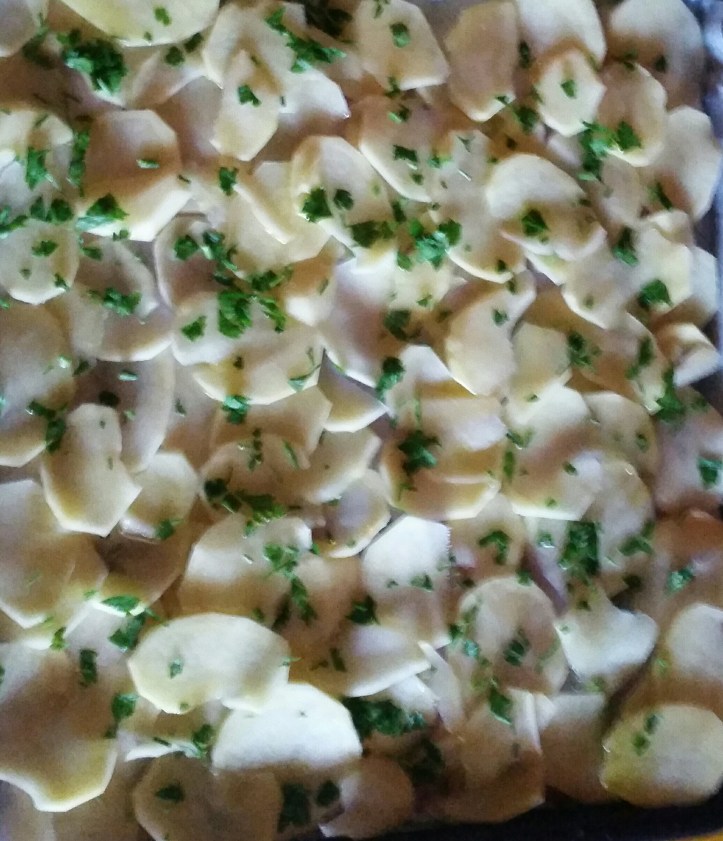 Per 4 persone. Sfilettate 4 spigole di media grandezza. Tagliate a fettine sottili 4 patate medie. Coprite una teglia con carta da forno. Ungetela con olio extravergine d’oliva e stendete uno strato di sottili fettine di patate. Disponete i filetti delle spigole sul primo strato di patate, salatele leggermente e ricopritele con altre fettine di patate. Condite con olio extravergine, aglio e prezzemolo tritato. Cuocere al forno a 180 gradi per 20 minuti.