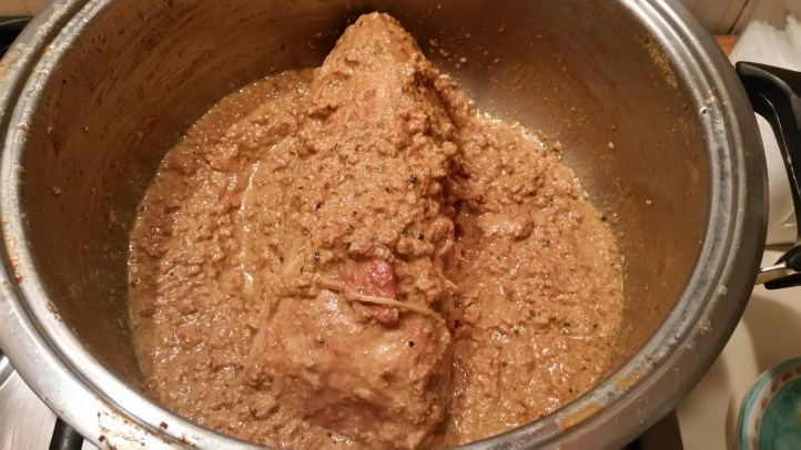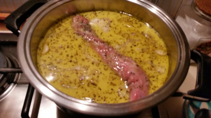 Per 4 persone.Mettere 800 grammi di girello in una pentola. Versare 1 dl di olio extravergine, due cucchiai di aceto, aggiungere uno spicchio d’aglio, un rametto di salvia, sale e pepe. Coprite e lasciate marinare per 6 ore voltando di tanto in tanto il girello. Al termine della marinatura versare nella pentola del latte fino a coprire completamente il girello. Portare il tutto a bollore poi continuare la cottura con la fiamma al minimo per almeno un’ora e mezza voltando di tanto in tanto la carne. Togliete la carne dalla pentola e fate restringere il sugo sul fuoco. Affettare la carne e servirla con il sughetto.