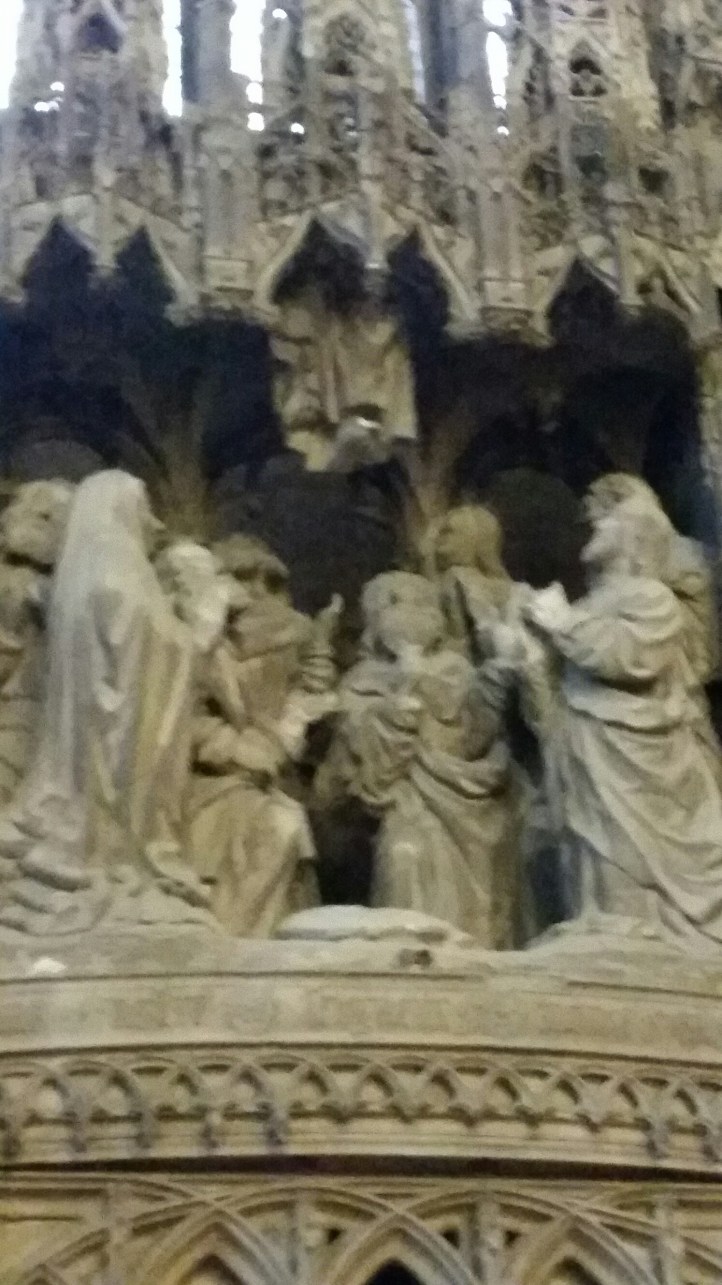 È davvero uno spettacolo straordinario. Colpisce non solo la sua grandezza. La cattedrale in stile gotico ha conservato l’integrità delle decorazioni sia scolpite che a vetri, rappresentative della storia del Cristianesimo. Oltre 4000 statue e 5000 personaggi, disegnati nelle vetrate, di una ricchezza di progressioni di colori mai vista, popolano la cattedrale che è stata miracolosamente risparmiata da tutte le guerre che si sono succedute nell’ultimo millennio. Compresa l’ultima che distrusse gran parte dell’antico tessuto urbano circostante.