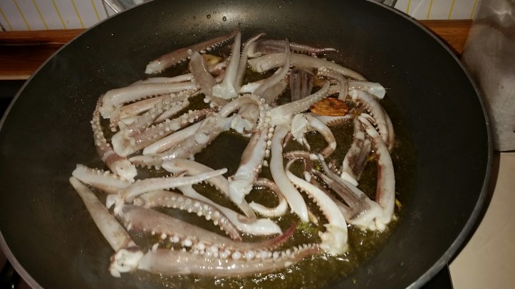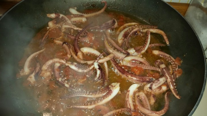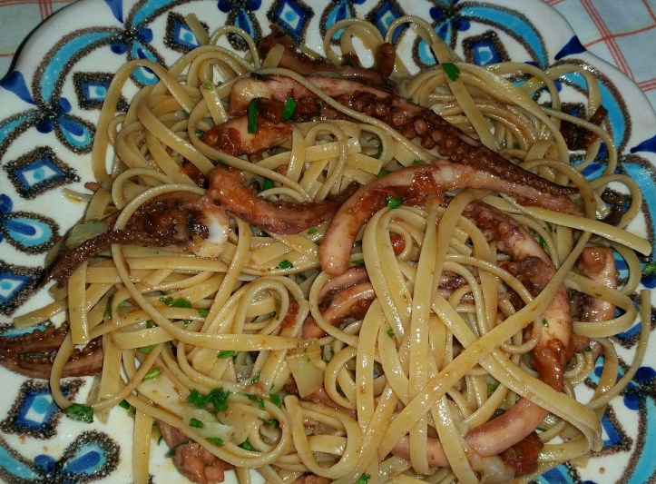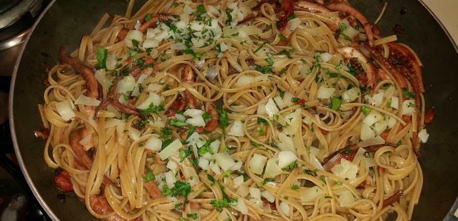 Per 4 persone. Fate soffriggere 2 spicchi d’aglio e un trito di gambi di prezzemolo in olio extravergine a fuoco bassissimo. Appena l’aglio imbiondisce aggiungere 300 grammi di ciuffi di calamaro e alzare la fiamma. Dopo pochi minuti versare un bicchiere di vino bianco e far sfumare. Aggiungere 10 pomodorini del Vesuvio privati della pelle e dei semi. Abbassare la fiamma, salare e far cuocere per 30 minuti. Nel fattempo fate bollire 320 grammi di linguine, scolatele al dente e fatele saltare nella padella con il sughetto. Aggiungete 150 grammi di provolone del monaco tagliato a cubetti e il prezzemolo e servite.