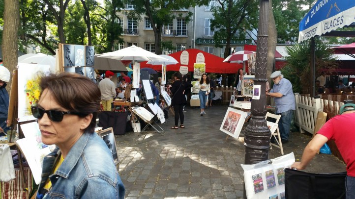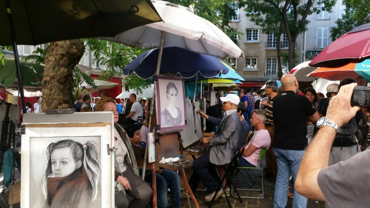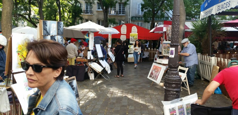 Io e Teresa molto più laicamente ci godiamo le deliziose stradine tortuose e le piazzette affollate di turisti, piene di gallerie d’arte, negozi, taverne, creperie, artisti di strada di ogni genere.