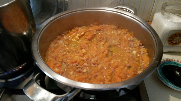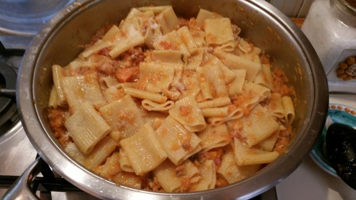Per 4 persone. Far soffriggere a fuoco bassissimo una cipolla tritata, 100 grammi di pancetta a cubetti, due pezzi di salsiccia sbriciolata. Quando la cipolla è appassita far sfumare con meno di mezzo bicchiere di vino bianco e aggiungere 8 castagne morbide sminuzzate grossolanamente. Aggiungere 800 grammi di zucca tagliata a cubetti. Mettete il coperchio e fate cuocere fino a quano la zucca diventa morbida e quasi disfatta. Scolate i paccheri molto al dente e fateli saltare nella padella con il sughetto. Cospargere di parmigiano e servire.