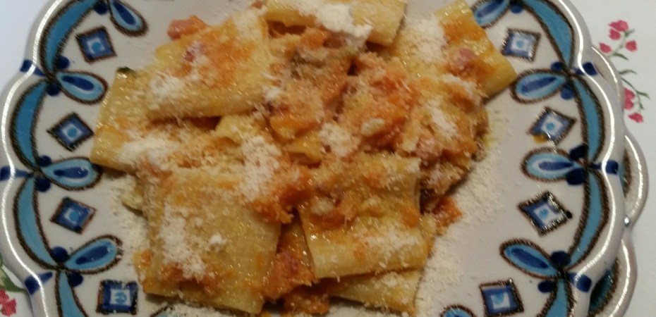 Per 4 persone. Far soffriggere a fuoco bassissimo una cipolla tritata, 100 grammi di pancetta a cubetti, due pezzi di salsiccia sbriciolata. Quando la cipolla è appassita far sfumare con meno di mezzo bicchiere di vino bianco e aggiungere 8 castagne morbide sminuzzate grossolanamente. Aggiungere 800 grammi di zucca tagliata a cubetti. Mettete il coperchio e fate cuocere fino a quano la zucca diventa morbida e quasi disfatta. Scolate i paccheri molto al dente e fateli saltare nella padella con il sughetto. Cospargere di parmigiano e servire.