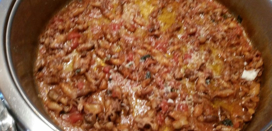 Lavare 400 grammi di calamaretti. Far soffriggere aglio e gamberi di prezemolo in olio extravergine. Non appena imbiodisce l’aglio aggiungere i calamaretti e alzare la fiamma. Dopo pochi minuti far sfumare con mezzo bicchiere di vino bianco. Aggiungere 10 pomodorini, privati della pelle e tagliati a listarelle, due cucchiai di passata e alcune foglie di basilico spezzettate. Abbassare la fiamma al minimo e grattuggiare nel sughetto il pecorino romano. Regolate di sale. Scolate i paccheri tre minuti prima della cottura per completarla nella padella con i calamaretti, nella quale avete aggiunto l’amido della pasta. Mantecate con pecorino romano grattuggiato, un trito di foglie di prezzemolo e di basilico.