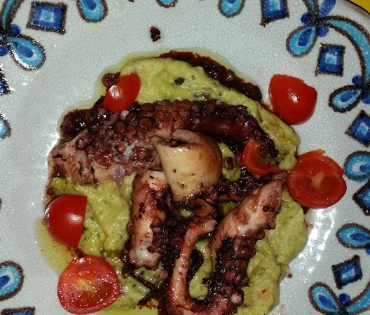 Per 4 persone. Far soffriggere uno scalogno in olio extravergine di oliva. Aggiungere il polipo di media grandezza (400/500 grammi), sfumare con il vino e far cuocere 45/60 minuti con pentola incoperchiata.Nel frattempo prendete 240 grammi di ceci precotti (oppure ammollati la sera prima e fatti cuocere in una pentola di terracotta ricolma d’acqua, con aglio e una costa di sedano per due ore) e fate soffriggere con aglio e sedano per pochi minuti. Frullare 2/3 di ceci con prezzemolo, rosmarino e semi di sesamo fino ad ottenere una passata vellutata. Regolare di sale. Distribuite nei piatti la crema di ceci, disponetevi i tentacoli del polpo e decorate con i ceci interi, alcuni pomodorini e foglie di prezzemolo.