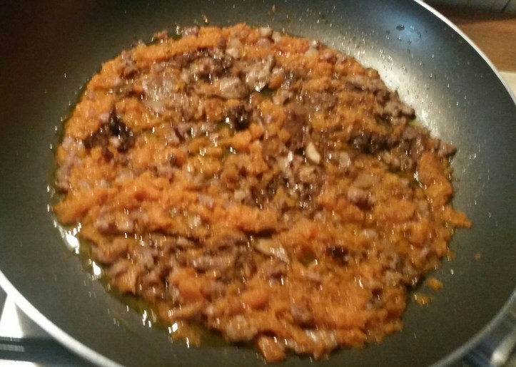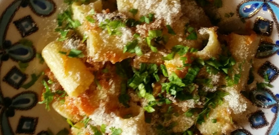 Per 4 persone:150 grammi di salsiccia, 200 grammi di funghi porcini e 350 grammi di zucca. Far soffriggere uno spicchio d’aglio in olio extravergine e poi aggiungere la zucca tagliata a cubetti. Quando la zucca diventa morbida ridurla in purea. In altra padella far soffriggere lo spicchio d’aglio con la salsiccia sbriciolata e sfumare con un po’ di vino bianco. Aggiungere la salsiccia nella padella con la zucca. Tritare finemente un piccolo scalogno, soffriggere in olio extravergine e poi aggiungere i funghi porcini. Versare il tutto nella padella con zucca e salsiccia. Scolare i rigatoni 2 minuti prima del punto di cottura, farli saltare in padella con zucca, porcini e salsiccia. Cospargere di parmigiano e prezzemolo.