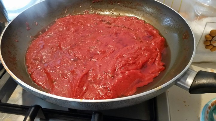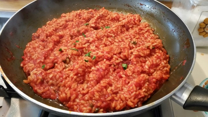 Per 4 persone. Fate imbiondire due spicchi d’aglio schiacciati ed un trito di gambi di prezzemolo in olio extravergine di oliva. Eliminate l’aglio e aggiungete 4 acciughe pulite e spezzettate e fatele sciogliere nell olio a fuoco bassissimo. Unite un cucchiaio di capperi dissalati, 200 grammi di olive nere snocciolate e tritate e dopo qualche minuto 750 grammi di passata di pomodoro. Salate a aggiungete poche foglie di prezzemolo. Fate cuocere per 30 minuti. Lessate 350 grammi di riso, scolatelo al dente e fatelo saltare nella padella con il sugo.