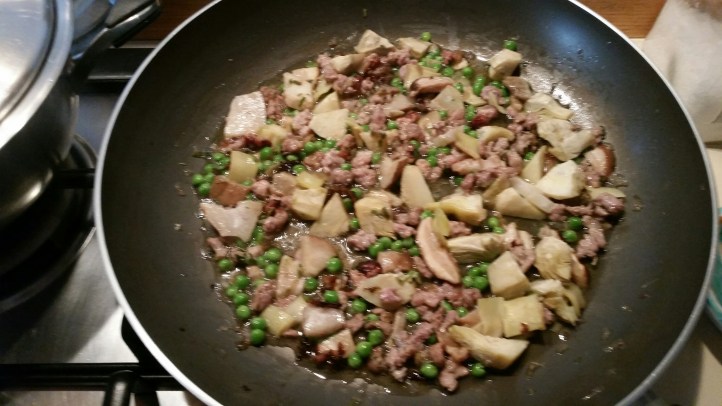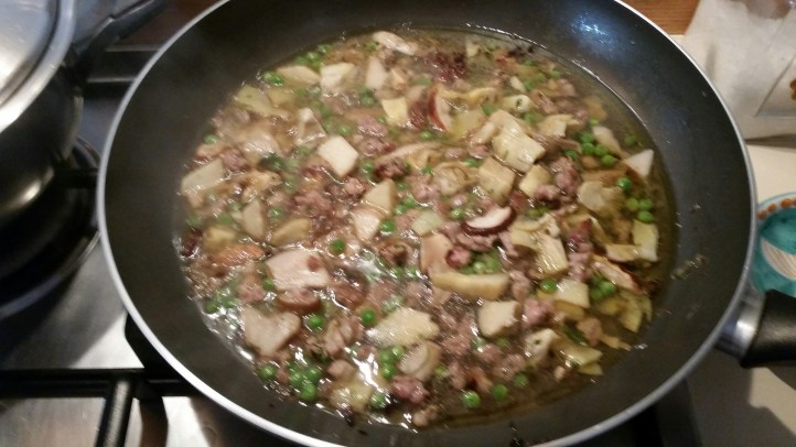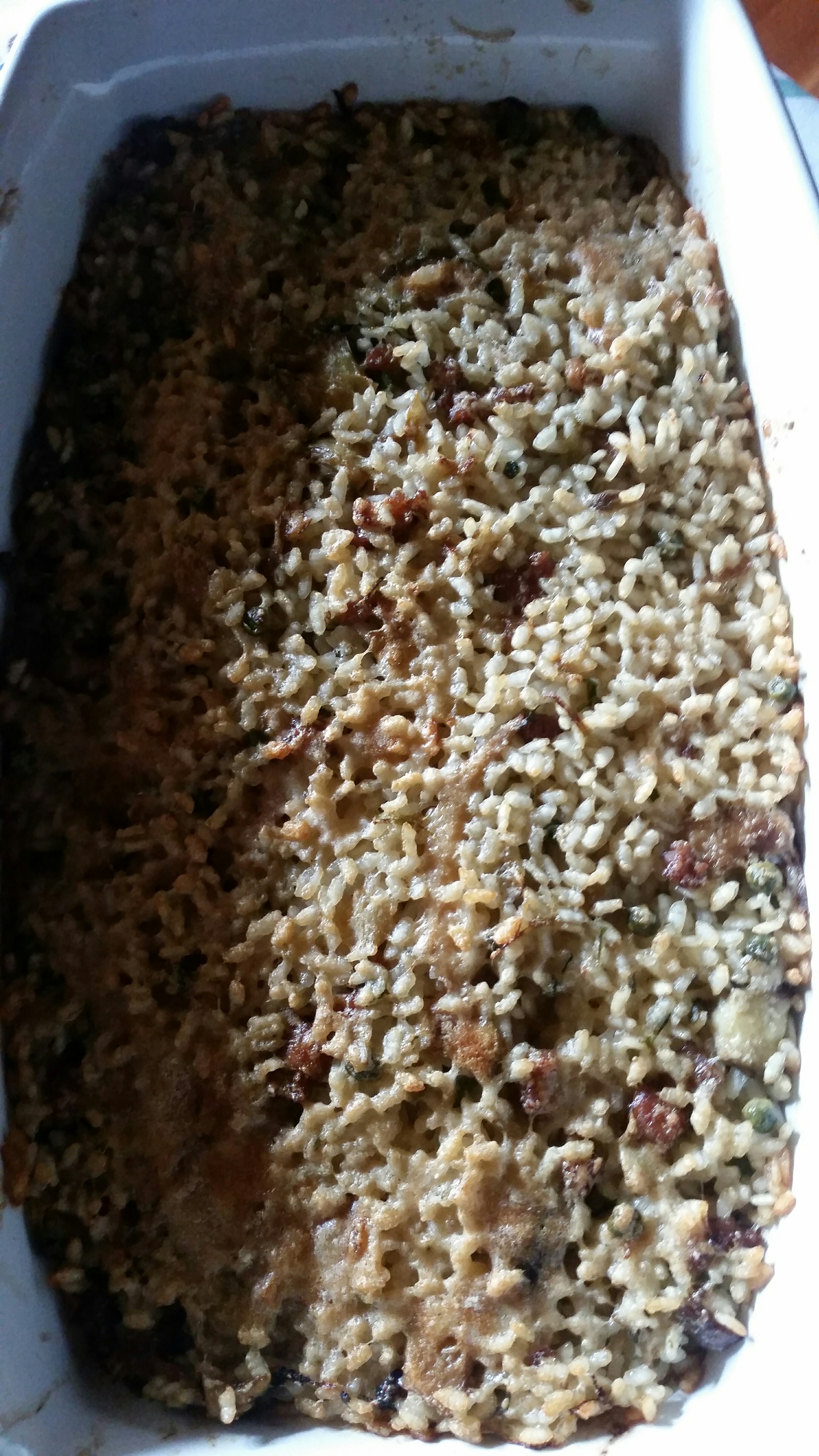 Per quattro persone. Far soffriggere in una padella 150 grammi di salsiccia sbriciolata con un trito di cipolla e gambi di prezzemolo in olio extravergine. Aggiungere 100 grammi di funghi porcini, 100 grammi di cuori di carciofo e 50 grammi di piselli. Dopo 5 minuti coprire con due dl di brodo e far cuocere per 20 minuti a fuoco lento. Nel frattempo lessate 350 grammi di riso vialone nano in acqua bollente. Scolateli. Aggiungeteli alla salsiccia e alle verdure e mescolate aggiungendo 50 grammi di parmigiano grattuggiato. Versate tutto in una pirofola da forno imburrata e cospargete di parmigiano. Fate cuocere nel forno a 180 gradi per 25 minuti fino a quando non si forma in superficie una crosticina dorata.
