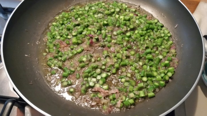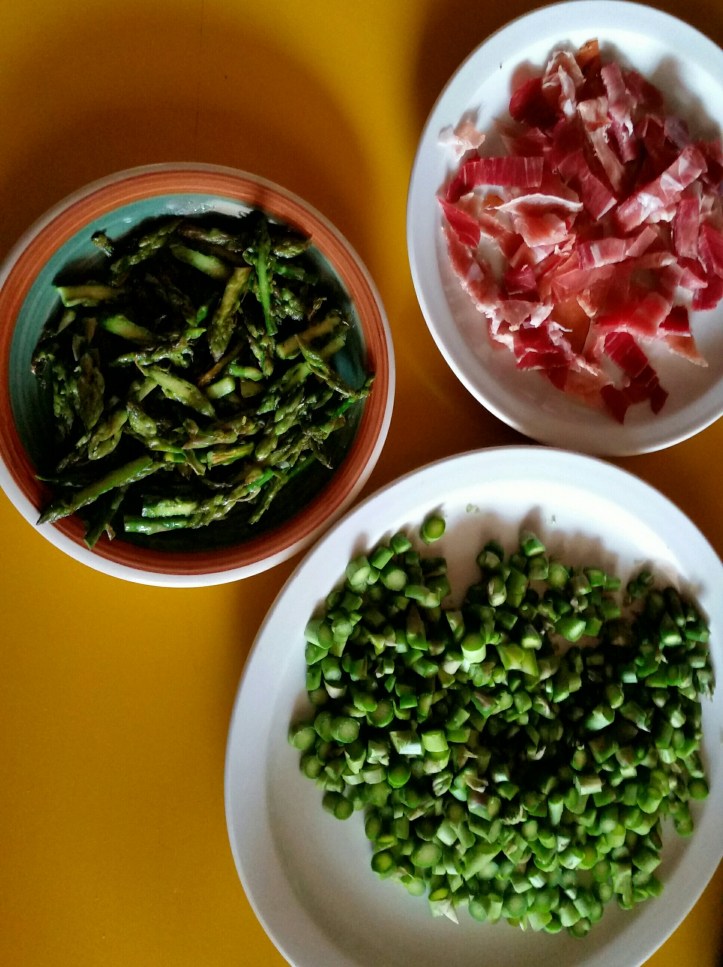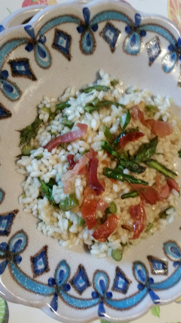 Per 4 persone. Lavare 400 grammi di asparagi. Rompete con le mani eliminando la parte da scartare. Dividete le punte dal resto, fatele soffriggere con l’aglio e tenetele D parte. Tagliate a rondelle l parte restante. Tostate 60 grammi di spek e tenetelo da parte insieme alle punte degli asparagi. Tritate una cipolla e fatela soffriggere in olio extravergine. Appena appassisce aggiungete la parte degli asparagi tagliati a rondelle e fate cuocere a fiamma bassa per 10 minuti. Nel frattempo fate tostare 350 grammi di riso vialone nano e fatelo brillare con mezzo bicchiere di vino bianco. Aggiungetelo al sughetto e portatelo a cottura aggiungendo ogni tanto un mestolo di brodo vegetale preparato in precedenza. A questo punto cospargete di parmigiano, aggiungete le punte di asparagi cotte in precedenza e lo spek tostato e servite.