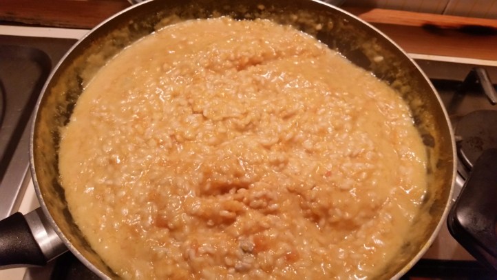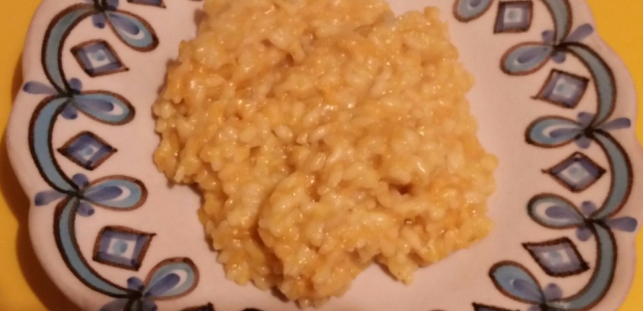 Far soffriggere a fuoco basso una cipolla tritata in olio extravergine. Aggiungere 500 grammi di zucca tagliata a dadini. Coprire la pentola fino al disfacimento della zucca. Far tostare 320 grammi di riso in altra pentola e poi aggiungerlo alla zucca. Portare a cottura aggiungendo ogni tanto un mestolo di brodo vegetale. Salare quanto basta. Negli ultimi 5 minuti di cottura del riso aggiungere 150 grammi di gorgonzola e 30 grammi di burro.