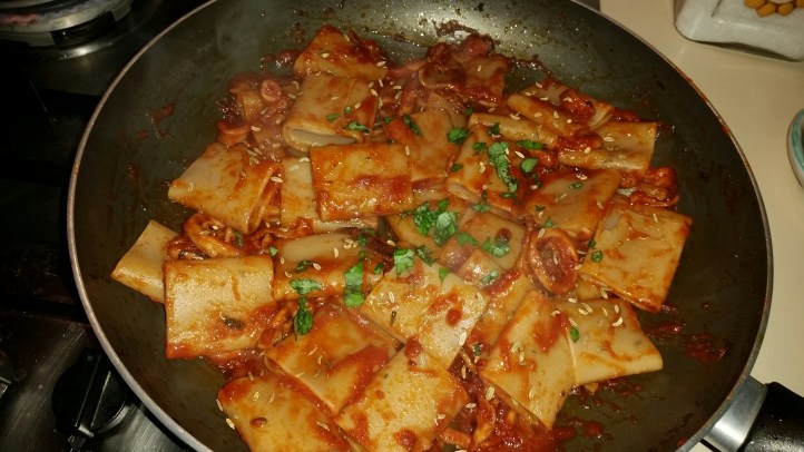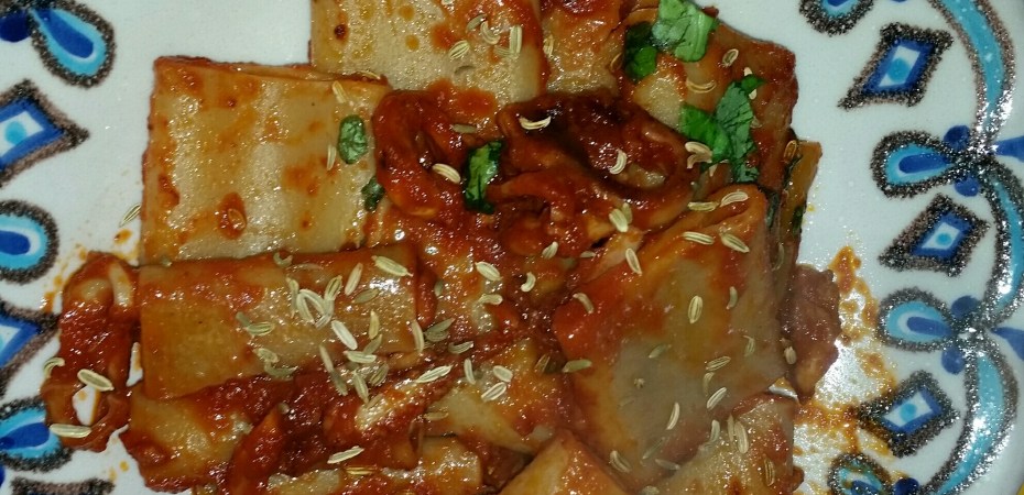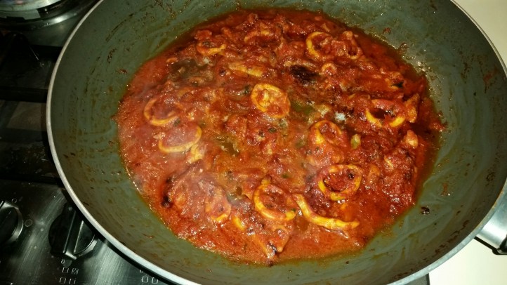 Per 4 persone. Pulite e tagliate a rondelle 2 grossi calamari. Fate soffriggere a fiamma bassa in olio extravergine 1 spicchio d’aglio e un cucchiaio di capperi. Aggiungete i calamari tagliati a rondelle e alzate la fiamma. Dopo pochi minuti versate mezzo bicchiere di vino bianco e fatelo sfumare. Aggiungete 300 grammi di passata di pomodoro ( o una ventina di pomodorini sbollentati e privati della pelle). Fate cuocere 300 grammi di schiaffoni di Gragnano e scolateli al dente. Fateli saltare in padella con il sugo e cospargete di semi di finocchio la pasta ancora calda in modo da farne sprigionare il profumo.