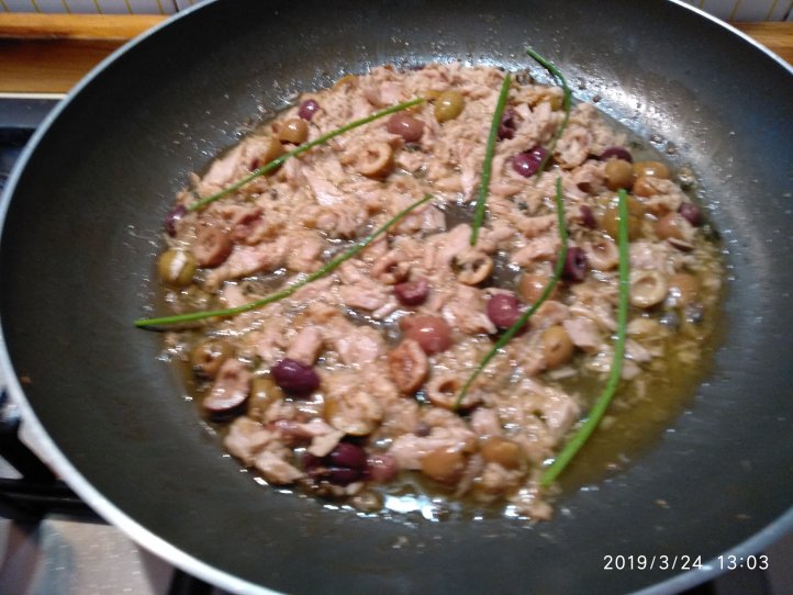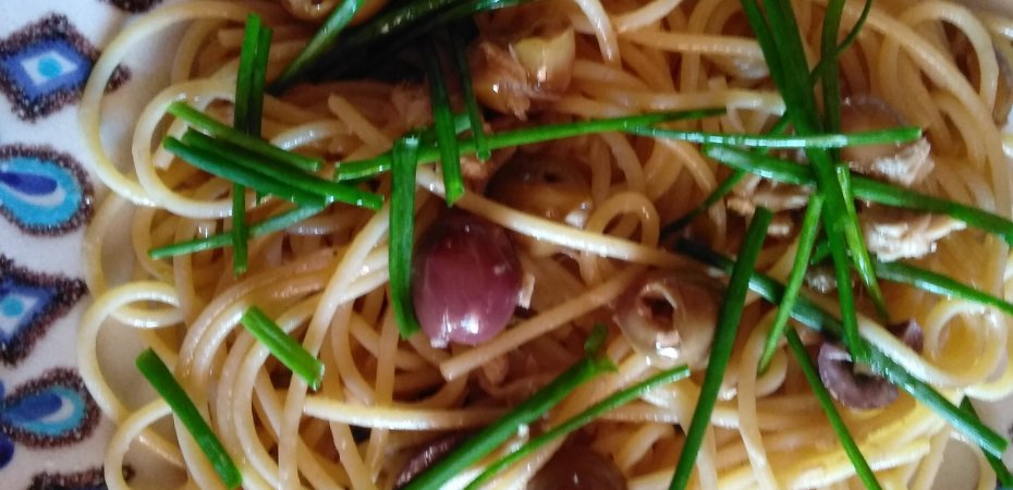 Per 4 persone. Fate soffriggere un trito di due acciughe, due foglie di basilico e gambi di prezzemolo con aglio e olio. Appena le acciughe si sciolgono nell’olio versate un po’ di vino bianco e fate sfumare. Togliete l’aglio e aggiungete un cucchiaio di capperi con 50 grammi di olive nere di Gaeta tritate e 300 grammi di filetti di tonno sott’olio. Portate a cottura 320 grammi di spaghetti, scolateli due minuti prima del tempo previsto e fateli saltare in padella con il sughetto aggiungendo erba cipollina fresca.