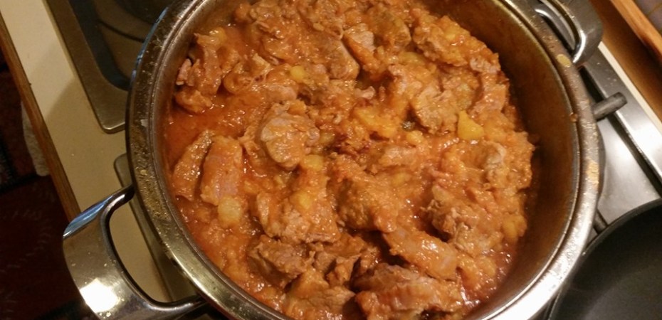 per 4 persone.Sbucciate circa 500 grammi di patate, lavatele e tagliatele a dadini non troppo piccoli. Tagliare la carne (700 grammi di c. vitello) a pezzi (leggermente più grandi dei dadi di patata). Fate soffriggere un trito di aglio, cipolla e carota in olio extravergine di oliva. Appena appassite le verdure aggiungete i pezzi di carne e delle foglie di salvia. Quando la carne prende colore sfumate con un buon vino rosso. Versate 3/4 cucchiai di passata di pomodoro. Unire i dadini di patate e fate cuocere per almeno due ore.