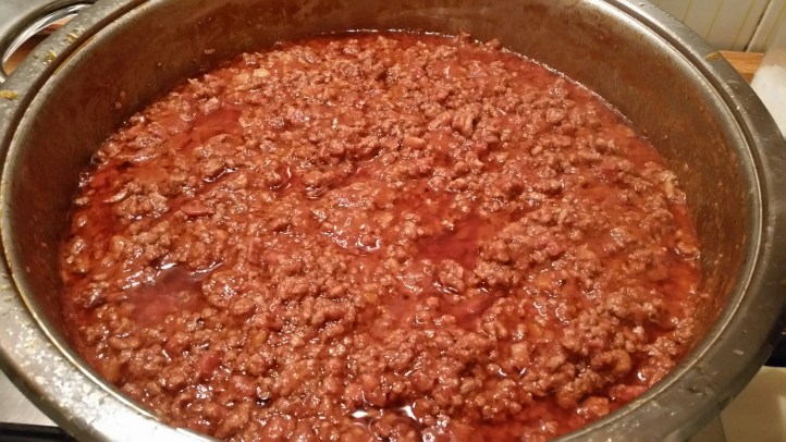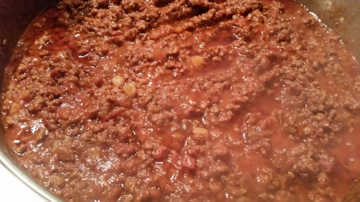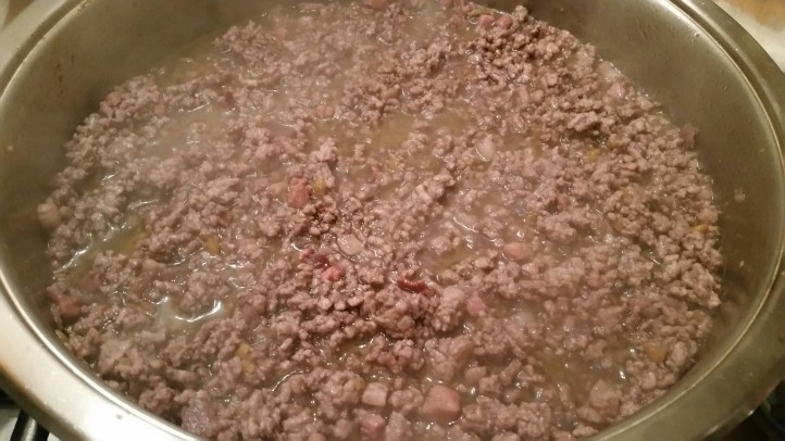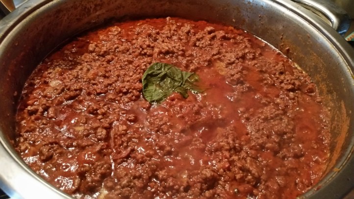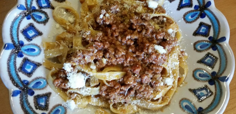 Per 4 persone. Dalla ricetta ufficiale depositata il 17 ottobre 1982 dalla delegazione di Bologna dell’Accademia italiana della cucina presso la Camera di Commercio di Bologna. Fate soffriggere 150 grammi di pancetta a dadini. Aggiungete un trito di 50 grammi di carota, 50 di sedano e 50 di cipolla. Appena le verdure appassiscono aggiungere 300 g di cartella di manzo macinata ( io aggiungo anche 300 grammi di puro suino macinato). Appena la carne prende colore aggiungere 1 dl di vino rosso e 5 cucchiai di passata di pomodoro. Fate sfumare il vino e allungate con brodo vegetale. Fate cuocere per 2 ore aggiungendo poco alla volta due dl di latte intero. Regolare di sale e pepe. Da sottolineare che la ricetta ufficiale prevede l’aggiunta di panna ottenuta dalla bollitura di 1 litro di latte intero. La mia variante prevede una maggiore quantità di passata di pomodoro e di vino rosso e niente panna.