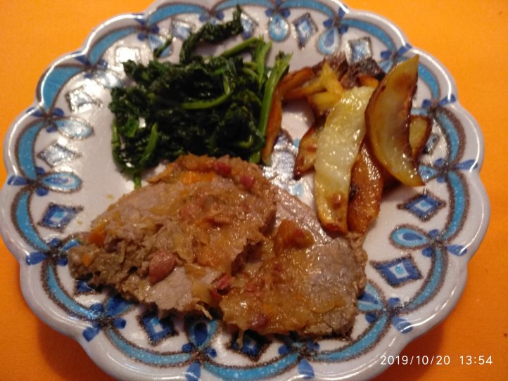Per 5 persone. Mettere in una casseruola un dl e mezzo di olio extravergine, un trito di una costa di sedano carota e un chilo e mezzo di cipolle ramate di Montoro, 150 grammi di prosciutto a tocchetti (in alternativa al salame napoletano), un girello di scottona da un chilo. Aggiungere 5 dl di acqua. Coprire e fare cuocere a fuoco lentissimo per due ore e mezza. Togliere il girello, alzare la fiamma e fare asciugare aggiungendo due dl di vino bianco fino ad ottenere una sughetto omogeneo scuro. Fare bollire 400 grammi di tortiglioni e condirli con il sugo. Aggiungere formaggio pecorino grattugiato. Utilizzare il girello per un secondo piatto di carne con contorno di patate e broccoli.