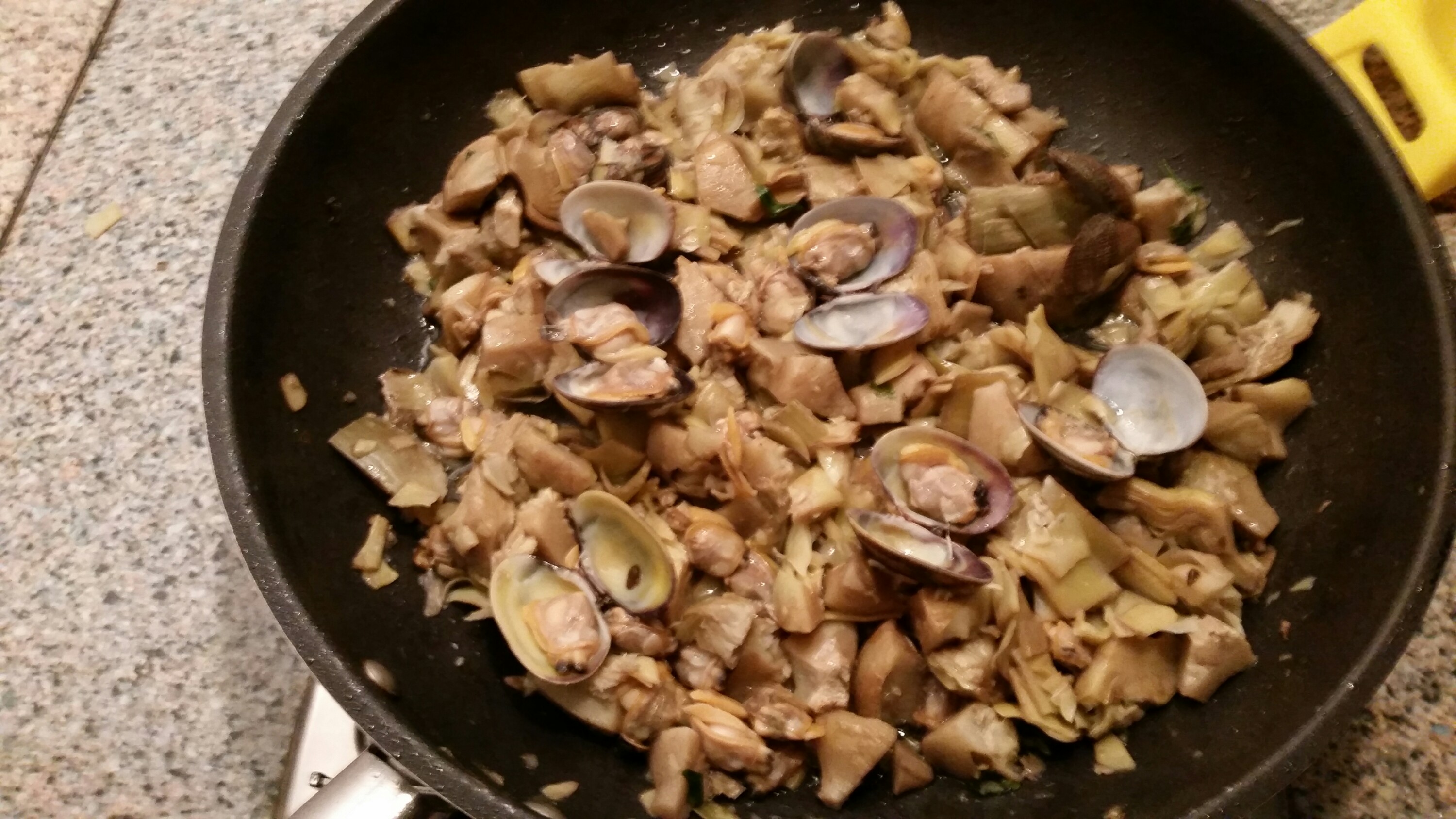 Per 4 persone. Pulire 1 chilo di vongole. Mettetele in un tegame con aglio, olio, un po di vino bianco, prezzemolo e fatele aprire. Sgusciare i molluschi e raccoglierli in una zuppiera con il liquido filtrato. In una padella far soffriggere a fuoco basso uno spicchio d’aglio con un trito di gambi di prezzemolo. Dopo pochi minuti aggiungere i cuori di carciofi e un po’ di liquido di cottura delle vongole. Scolare i vermicelli due minuti prima della cottura e fateli saltare in padella con il sughetto cospargendoli di prezzemolo.