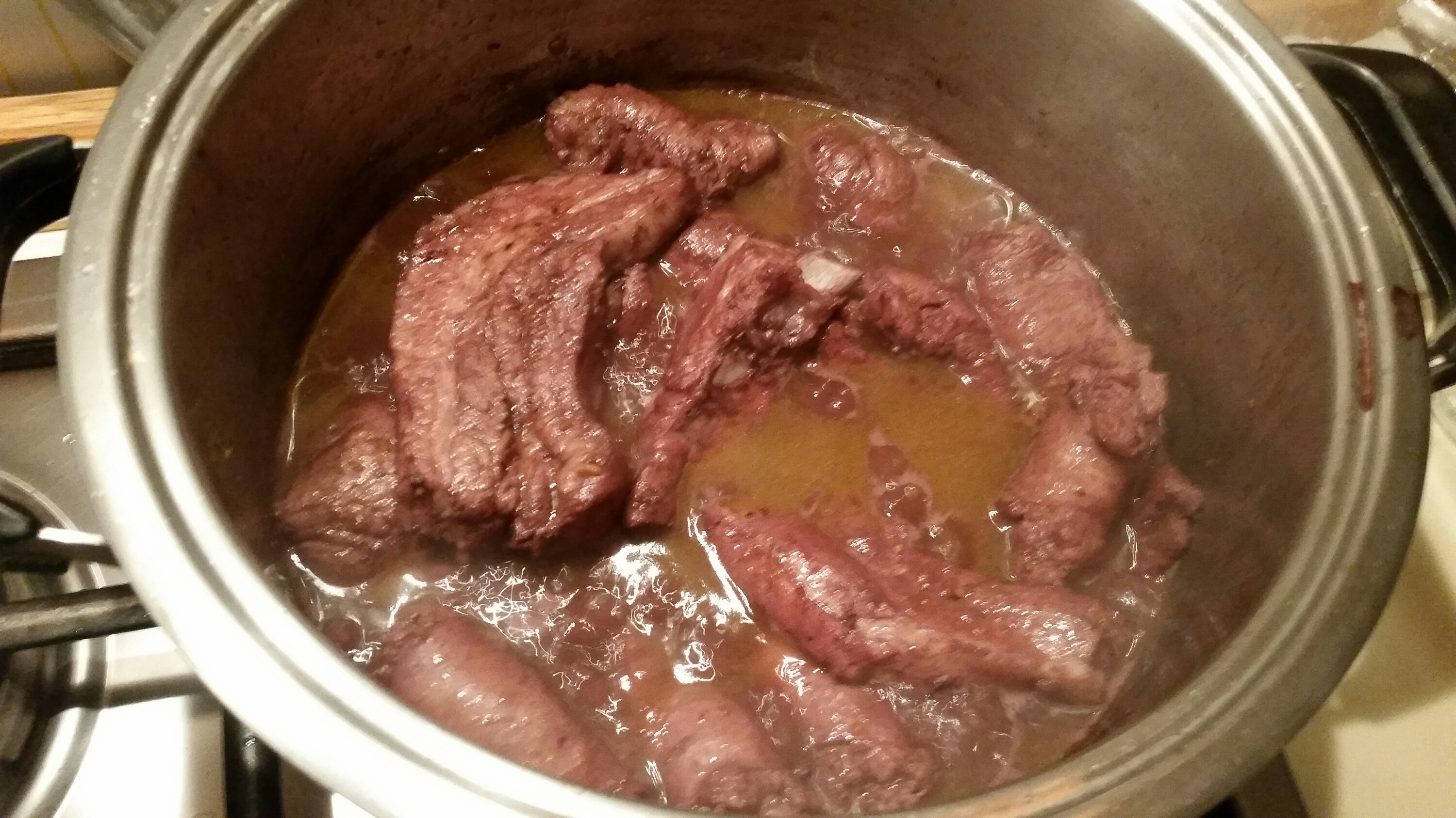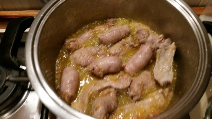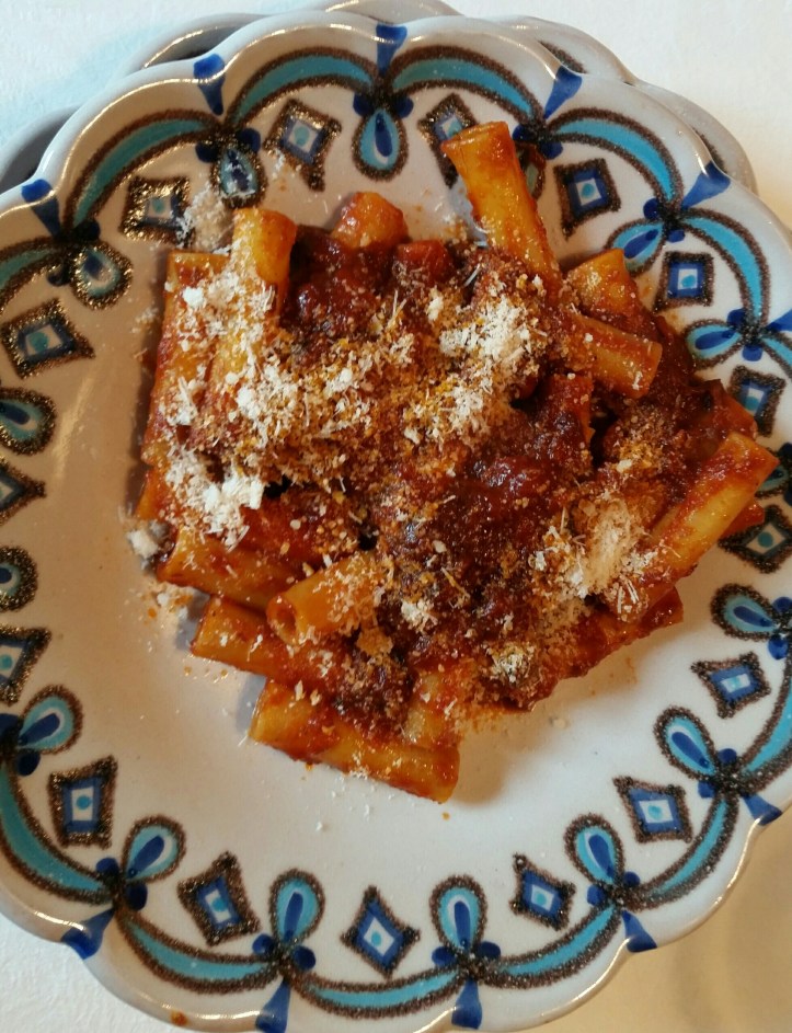 Per 4 persone. Tagliate a pezzetti 300 grammi di salsiccia. Preparate degli involtini con 400 grammi di fettine scelte di vitello riempite di prezzemolo, sale e qualche dadino di pancetta. Fate sbollentare 300 grammi di puntine di maiale. In una pentola capiente fate soffriggere in olio extravergine a fuoco lento 100 grammi di pancetta tagliata a dadini e un trito di cipolle e carote. Fate rosolare poi aggiungete gli involtini, i pezzi di salsiccia e le costine di maiale e fate rosolare a fuoco medio. Poi versate e fate sfumare 5 dl di vino rosso. Aggiungete un litro di passata di pomodoro con foglie di basilico fresco sminuzzate. Regolate di saleFate cuocere fino ad ottenere un sugo denso e cremoso.